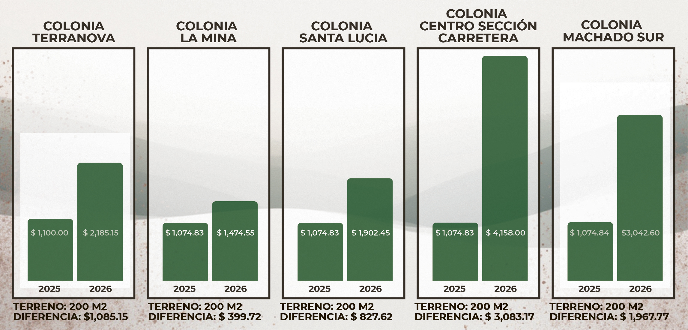 Por ejemplo, el fraccionamiento Real de Rosarito, conformado principalmente por viviendas y departamentos de interés social, enfrentaría un incremento del 282% en su valor catastral, al pasar de un valor vigente en 2025 de $900.00 pesos por metro cuadrado, a $3,438.00 pesos en 2026, lo que representa un aumento absoluto de $2,538.00 pesos por metro cuadrado.