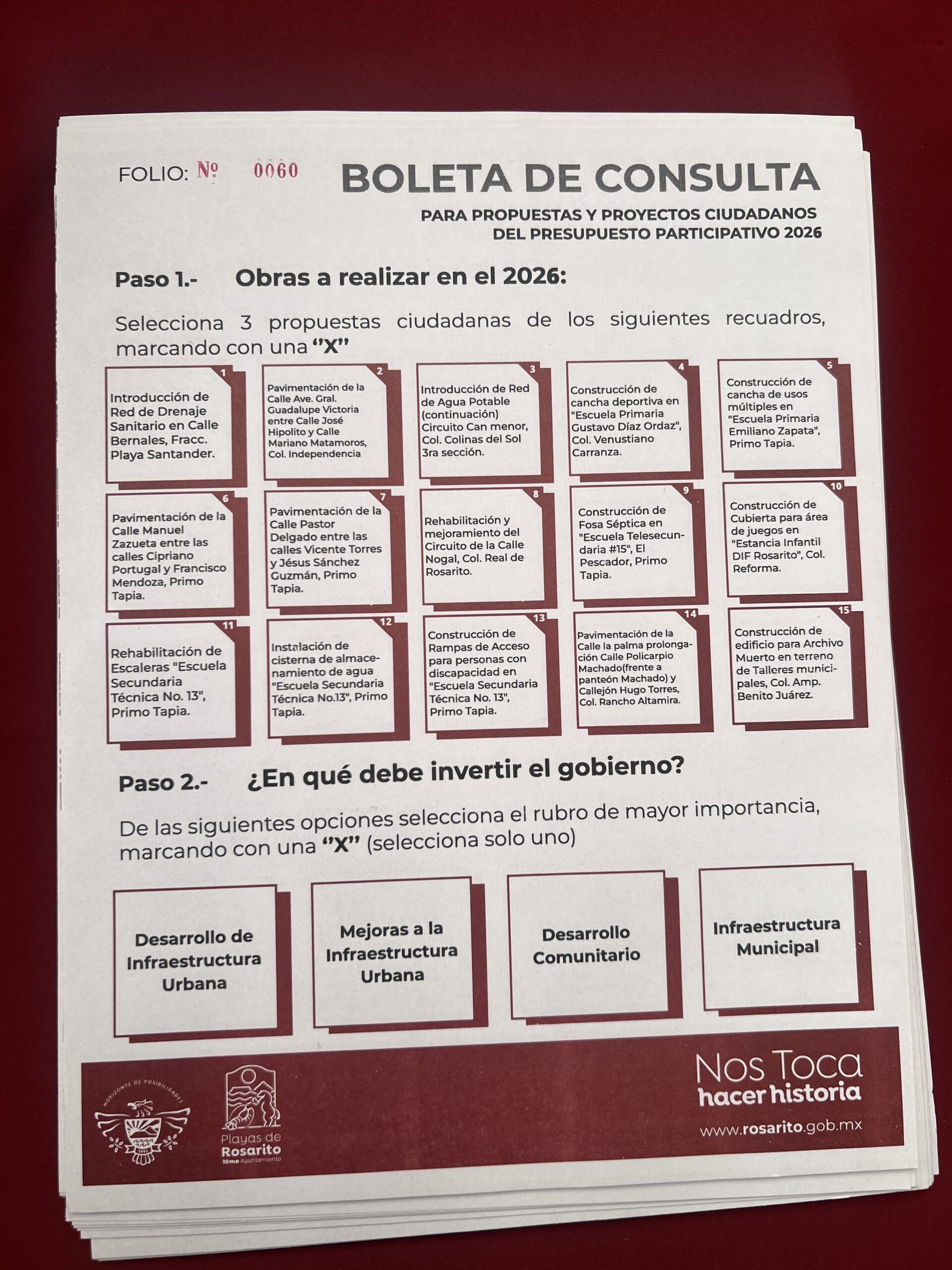 Una vez que el contribuyente paga su predial pasa a la mesa donde se encuentran las encuestas del “Presupuesto Participativo 2026”, donde podrá elegir tres proyectos.