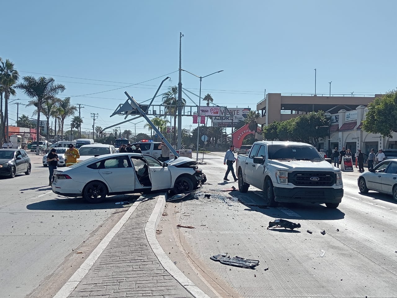 Un hombre que viajaba en un vehículo particular de color blanco, se impactó contra un poste de alumbrado público y un alto de disco del camellón central del bulevar Benito Juárez, cuando era perseguido por elementos de la FESC que viajaban en una camioneta blanca sin logos, la cual logró evitar el impacto y resultó sin daños.