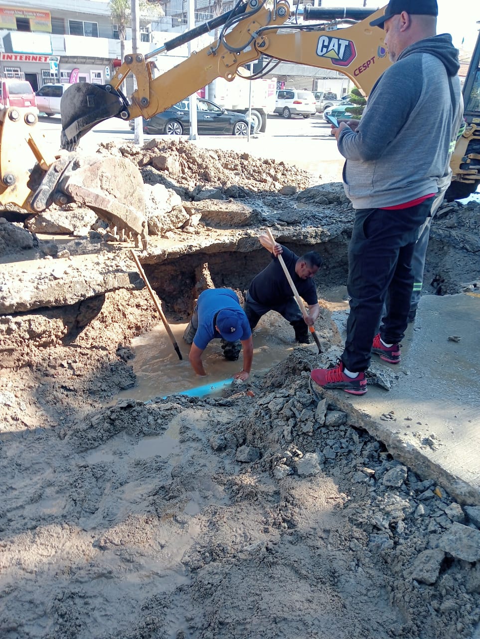 La CESPT envió de inmediato equipo técnico y maquinaria para comenzar las labores de ruptura del concreto hidráulico y posteriormente proceder con la ubicación y reparación de la fuga en una línea de 8 pulgadas.
