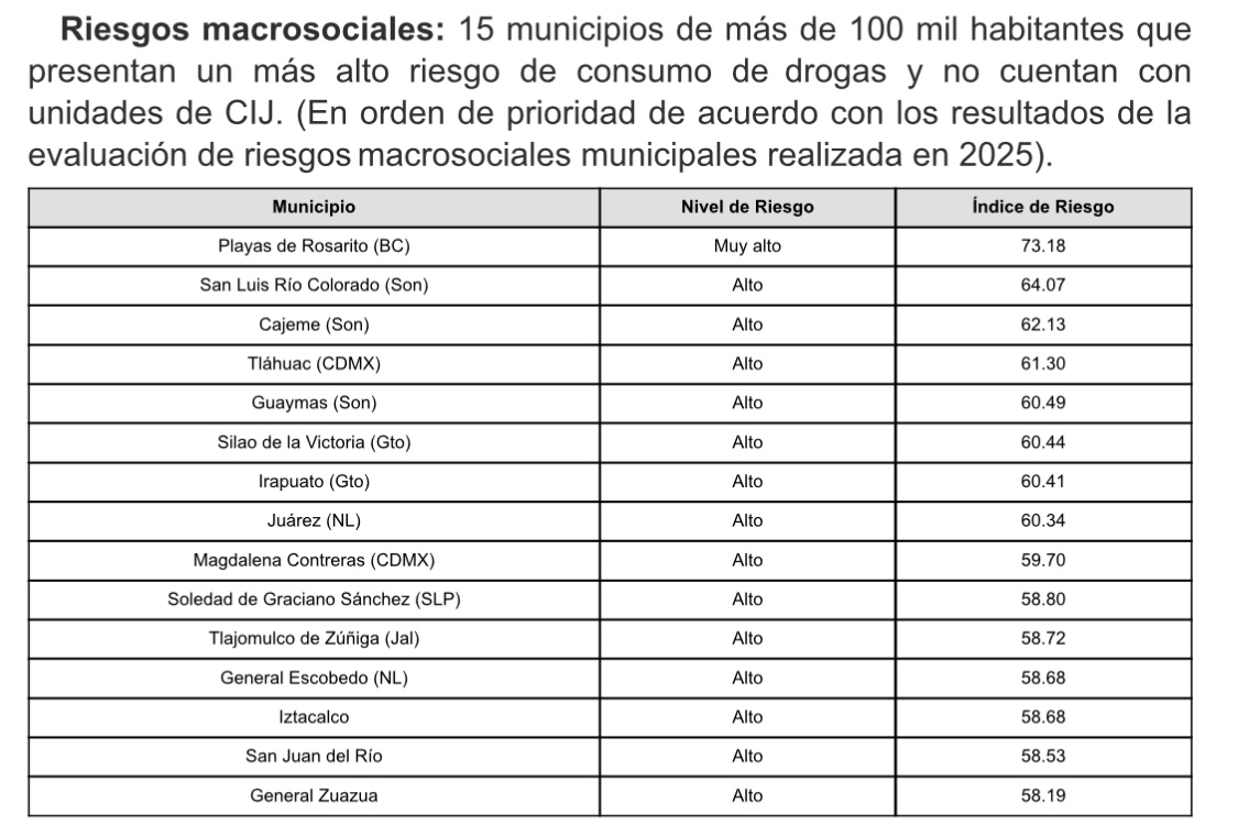 Rosarito encabeza la lista de los 15 municipios de México con más de 100 mil habitantes que presentan un alto riesgo de consumo de drogas y no cuentan con unidades de Centros de Integración Juvenil (CIJ) esto de acuerdo con el Programa Institucional 2025-2030 de los CIJ.