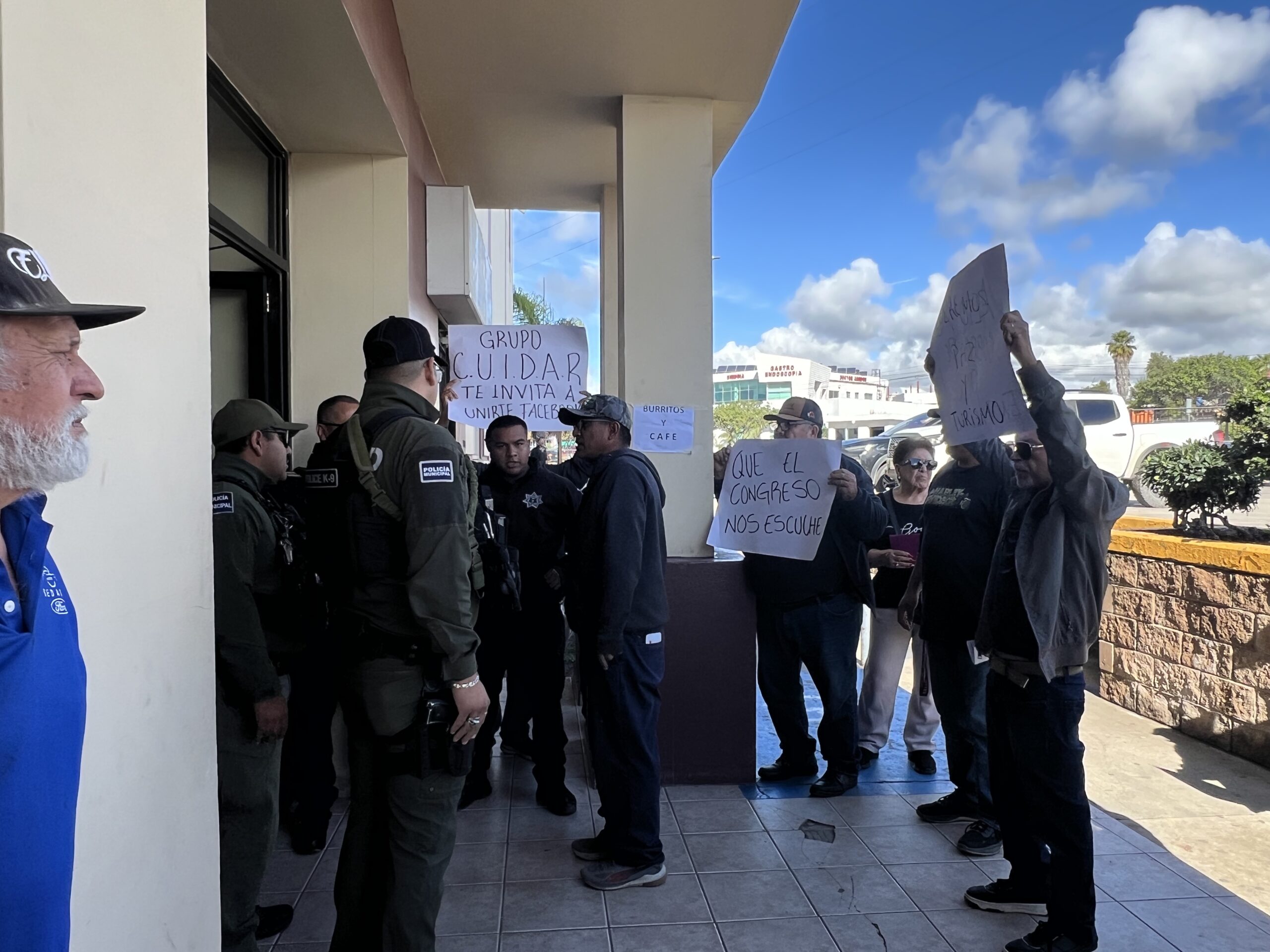 Los ciudadanos manifestantes lanzaron diversas consignas tras sentirse intimidados con la presencia de los oficiales quienes restringieron el paso, solo a ciudadanos que argumentaron ir a pagar el impuesto predial.