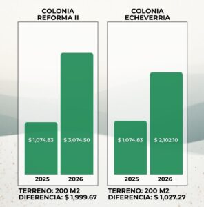 Un ejemplo concreto es la colonia Reforma II, identificada en la zona homogénea 2003, que va a tener un valor por metro cuadrado de 5, 950 pesos.
